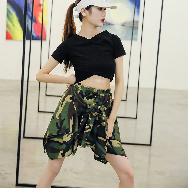Jazz Street dance Cheerleading Dance Costmues For Women Camouflage Shorts Black White T-shirt Round